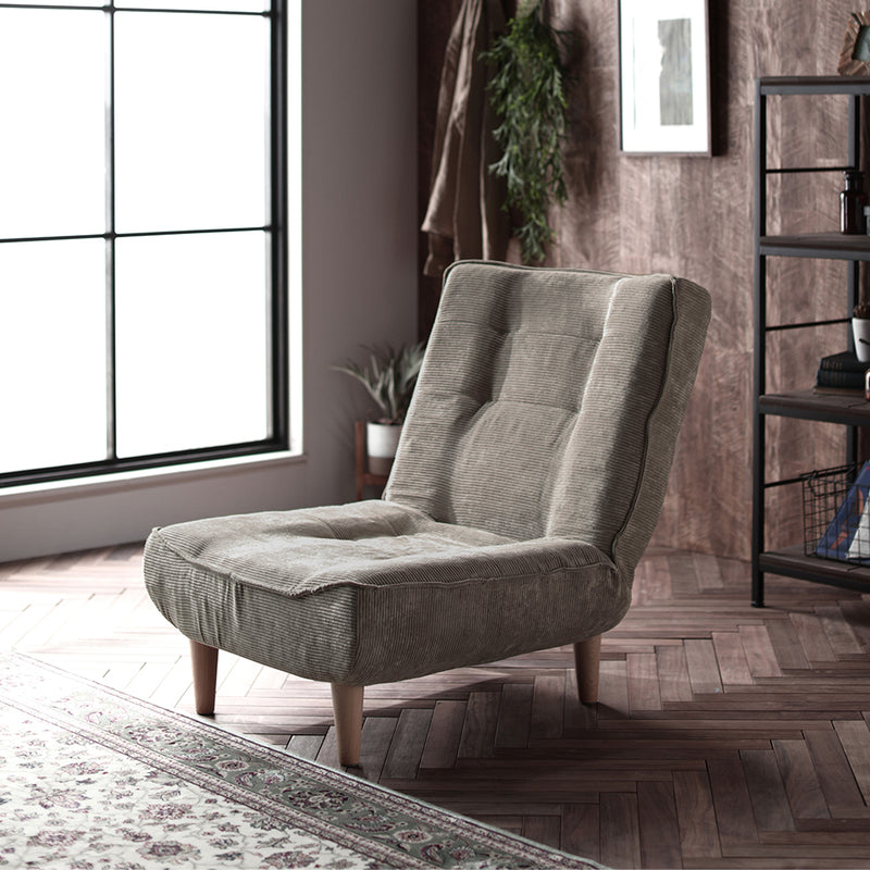 家具350(サンゴーマル)のリクライニングソファ Fit2Fは、脚付きの座椅子で、腰部分が6段階、ヘッド部分が5段階と細かくリクライニングが調整できるのが魅力です。