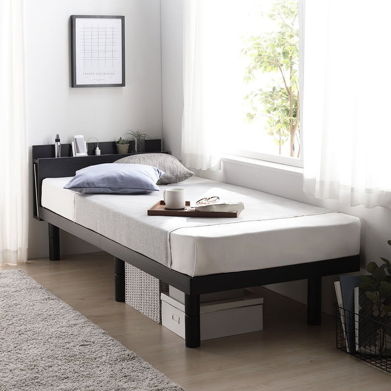 ヘッドボードには棚がついており、さらにコンセントもあるので、日中も寝る前もくつろげます。