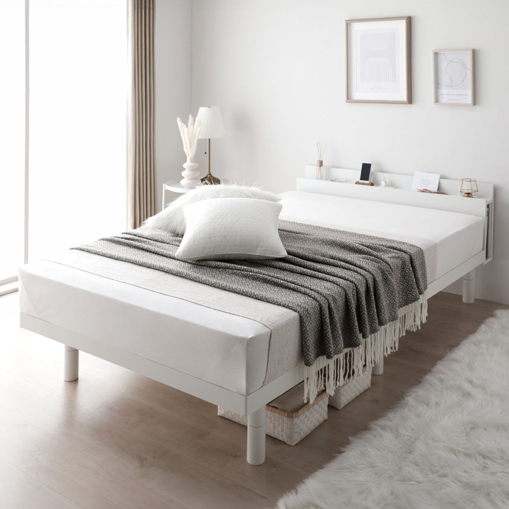 ヘッドボードにはコンセント口と、スマホや眼鏡を置くにはぴったりなサイズの収納スペースが付いているのでベッド周りをコンパクトにまとめられますね。
